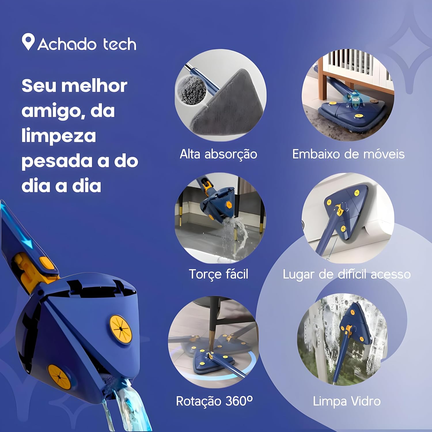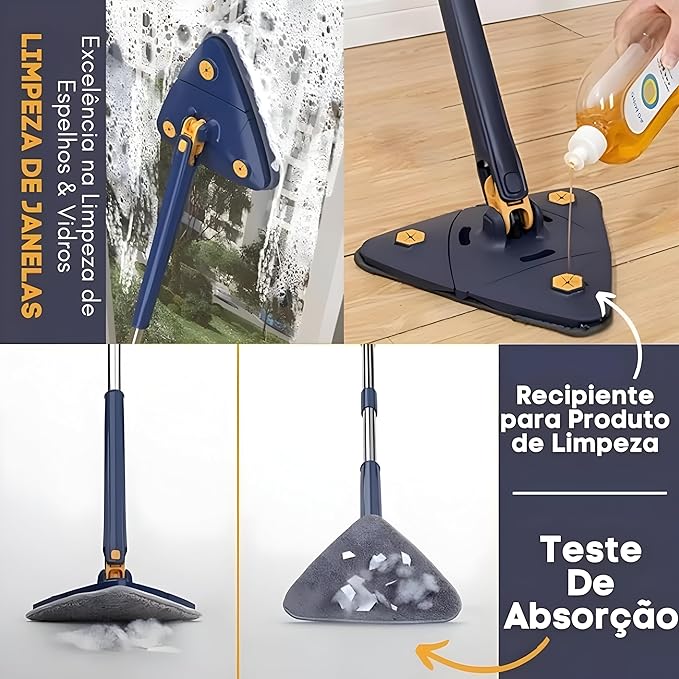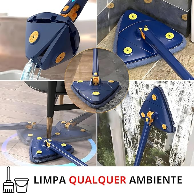 Com o Mop Triangular 360º Giratório, você pode limpar sua casa inteira de maneira mais rápida, eficiente e sem o trabalho manual pesado. Seu design inovador permite alcançar os cantos mais difíceis e realizar a faxina sem precisar se preocupar com sujeira nas mãos ou em superfícies delicadas.